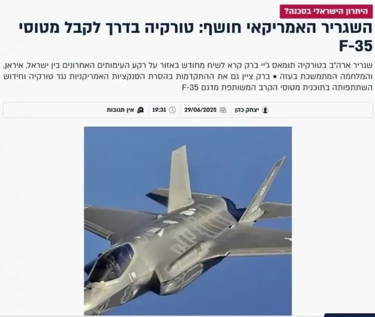 İsrailin “hmnews.il” saytı xəbəri “Türkiyə nəhayət F-35 yoluna girdi” başlığı ilə təqdim edib.