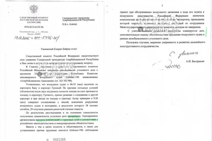 “2025-ci ilin dekabrında Qazaxıstanın Aktau şəhərinin yaxınlığında qəzaya uğrayan AZAL təyyarəsi əlverişsiz hava şəraiti səbəbindən Rusiya ərazisində eniş edə bilməyib. Bu əsasla da Rusiya Federasiyasının İstintaq Komitəsi cinayət işinə xitam vermək qərarına gəlib”.