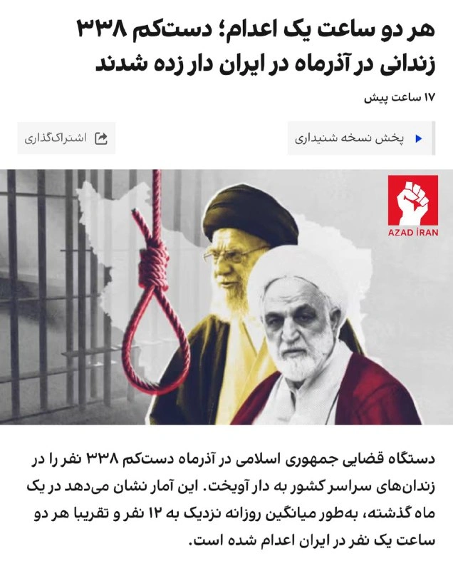 İranda İnsan Haqları Müdafiəçiləri Qrupu – HRANA-nın məlumatına görə, 22 noyabr – 22 dekabr tarixləri arasında ölkə zindanlarında ən azı 338 məhbus dar ağacından asılıb.