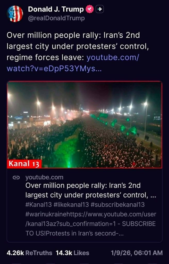 Xüsusi.Tv xəbər verir ki, ABŞ lideri İranda baş verən son hadisələrlə bağlı Azərbaycanın yutub üzərindən yayımlanan “Kanal13.TV” platformasına istinad edib.